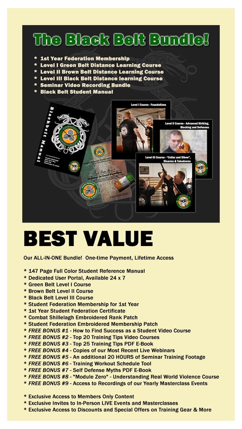 This entire Bundle normally sells separately for $1,021.00, but we want to see you go all the way to Black Belt! And the best way to do that is by having access to the entire video library AND the reference manual for your studies. If you are serious about being a student of Irish Stick Fighting with the Blackthorn Shillelagh (pronounced “shalaylee”, or “sheleighly”), this is the right choice to make.