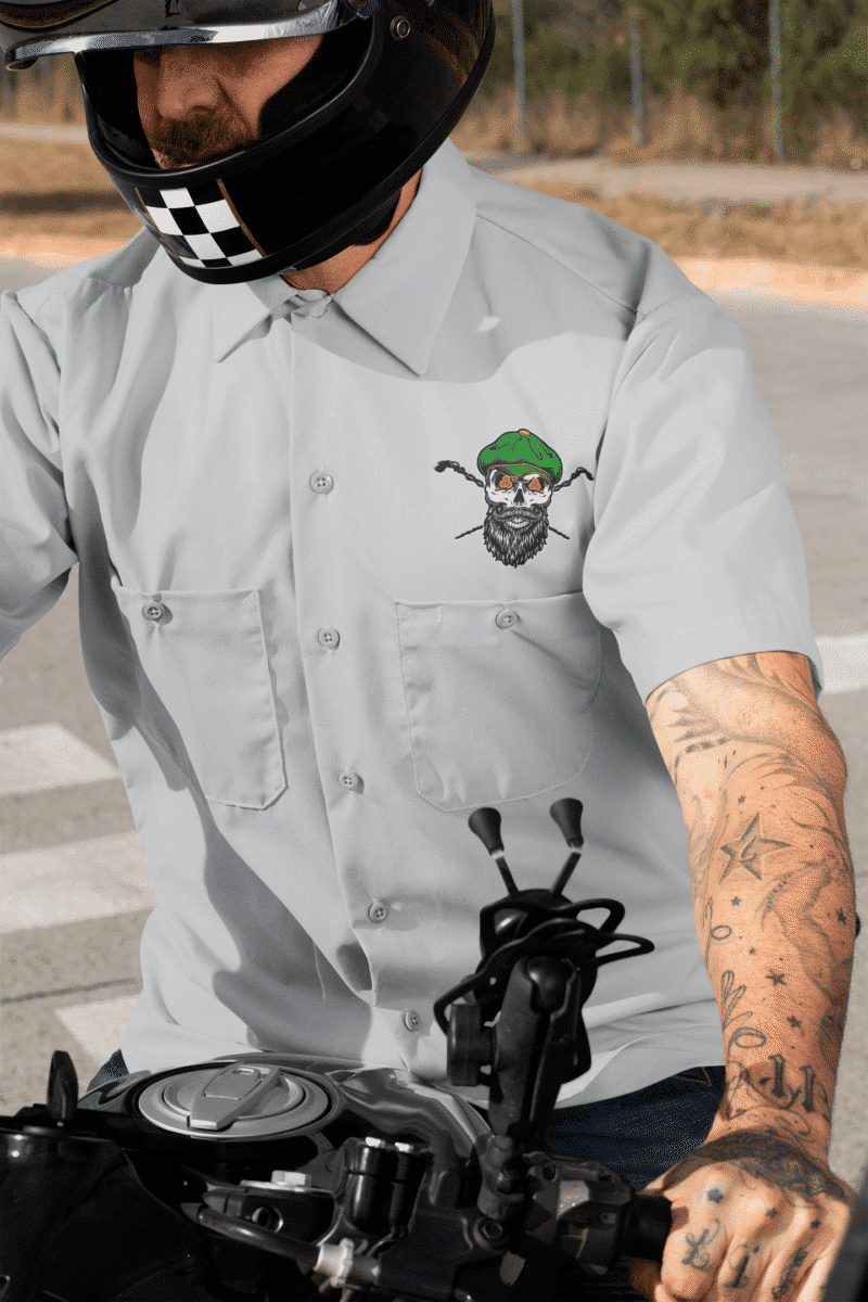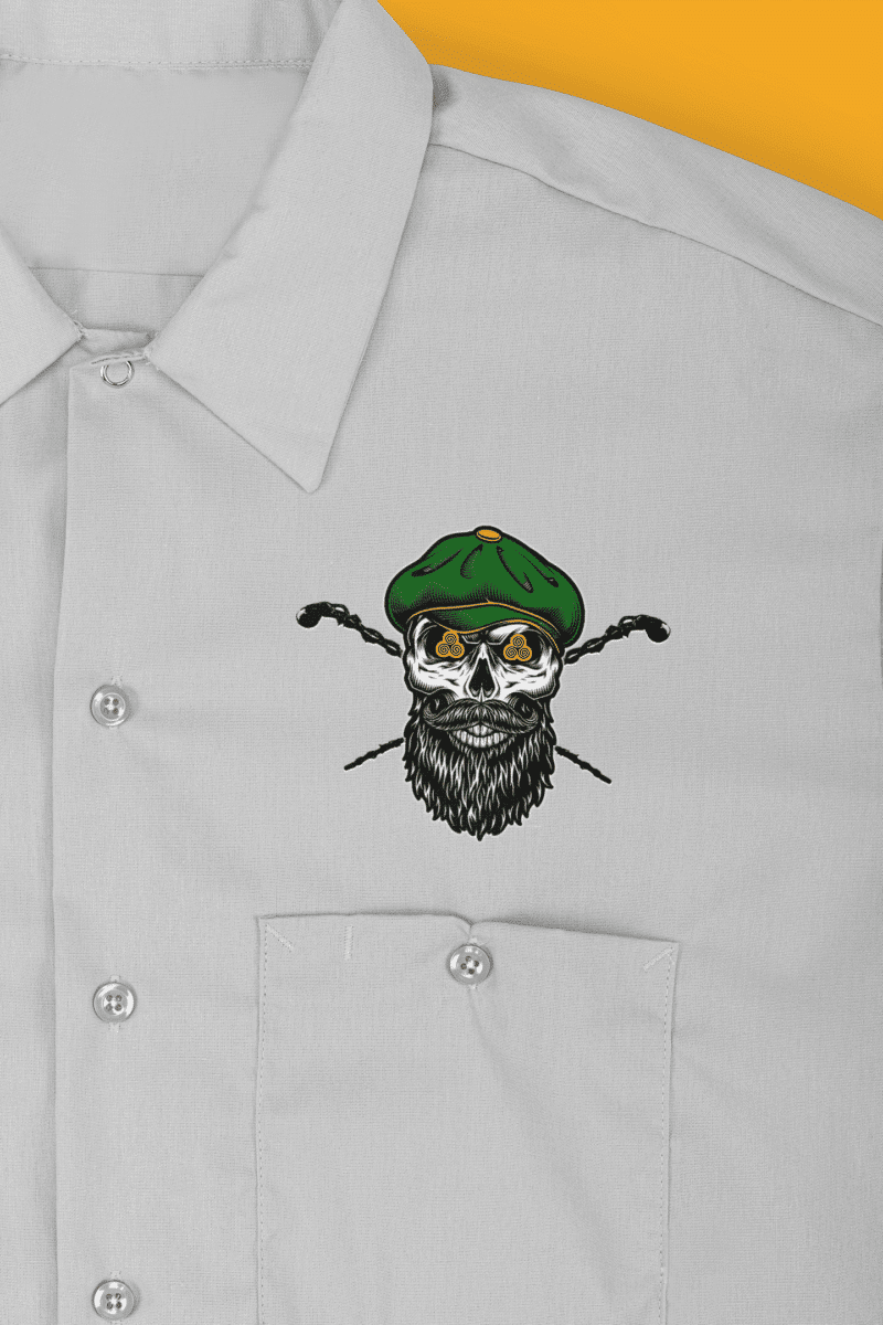Combat Shillelagh Short Sleeve Work Shirt – New product for all of you Shillelagh Stick Fighting Enthusiasts out there! A Dickie’s short sleeve work shirt with a color image of a bearded skull and two crossed shillelaghs on the left chest above the pocket. These are very sturdy and comfortable shirts that will wear like iron! A great addition to your casual wardrobe.